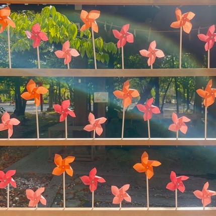 市原稲荷神社様の「和紙かざぐるま」は赤系の色を3色使うことで、まるで秋の紅葉を見ているような気持ちになれます。
